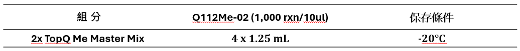 • TopQ Me Master Mix (#Q112ME) 是一種 Taqman 探針法甲基化分析之專用預混液。