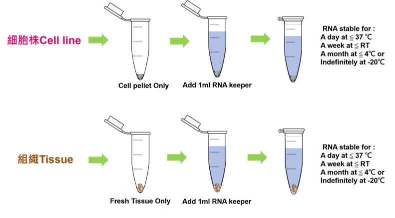 | 3 | 於4°C 或室溫 保存 2hrs以上(此步驟, 為了能讓RNA Keeper浸潤細胞完全。請避免直接丟冷凍, 會導致細胞破裂, 影響後續RNA品質) |