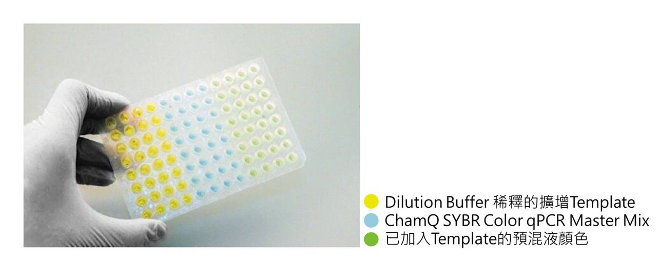 ChamQ SYBR Color qPCR Master Mix 中包含藍色染料, 而10×Dilution Buffer中包含黃色染料。當 ChamQ SYBR Color qPCR Master Mix(藍色)中加入了用Dilution Buffer稀釋的擴增範本(黃色)後會產生藍色→綠色的變色效應,從而可以 根據體系顏色準確判斷是否已加入範本。