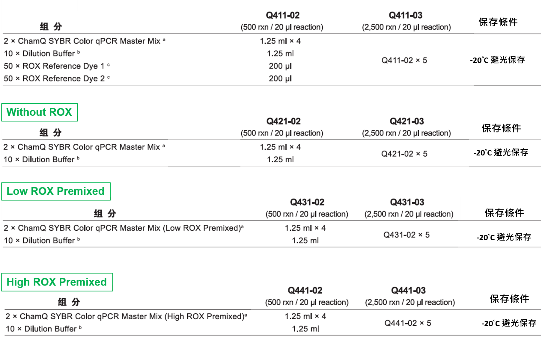 | Q421-03 | 2 X ChamQ SYBR Color qPCR Master Mix (Without ROX) | 25ml (2500 rxn) |
