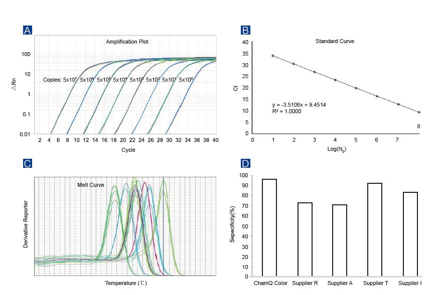圖A是將pUC19質粒進行8 個10倍梯度稀釋,圖B是根據圖A的Ct 值繪製的標準曲線。第8個梯度稀釋中質粒拷貝數濃度約為5copies/4 μl,使用ChamQ Color 預混液對各稀釋梯度中的pUC19質粒進行檢測,每孔範本使用量為4 μl。可以看到,ChamQ Color 預混液在寬廣的範本量區間具有優秀的線性關係,可以檢測出具有個位數拷貝的待測範本,靈敏度極高。